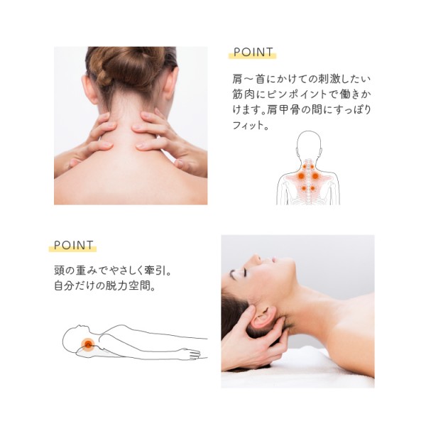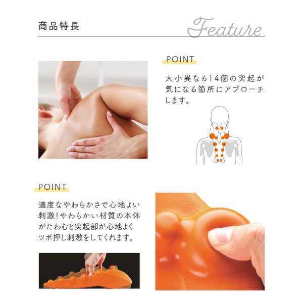 14個の押圧突起が、肩・首の悩みの原因である筋肉(僧帽筋・菱形筋・肩甲拳筋)に沿って、刺激するように配置されているので、寝転ぶだけで、肩コリをスッキリ解消してくれます。