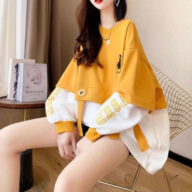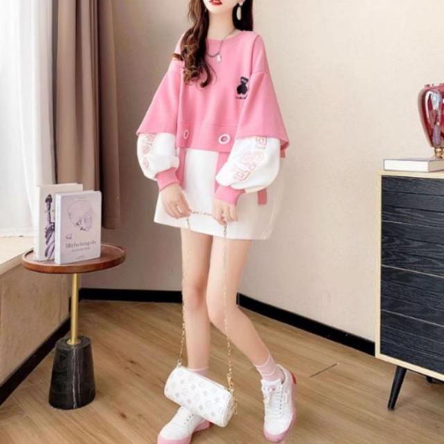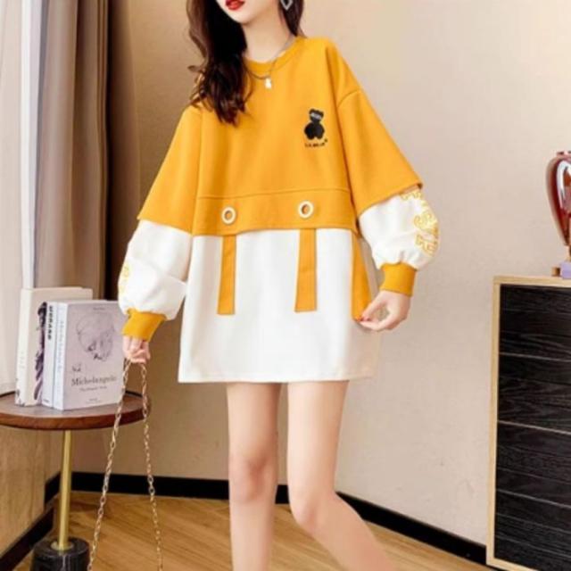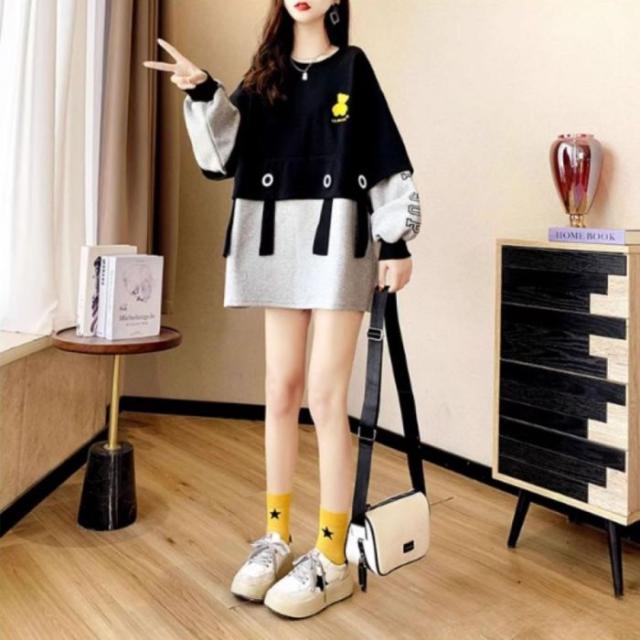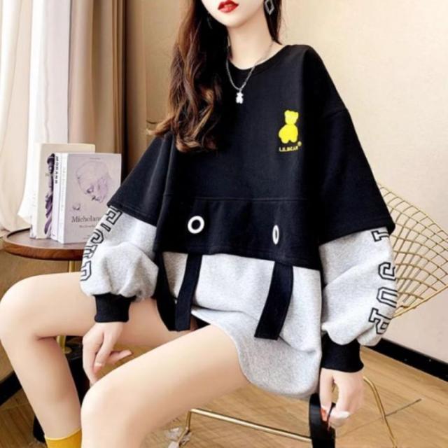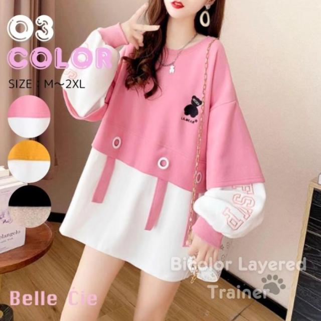 トレーナー ジャージー スウェット 長袖 バイカラー トップス レディース 韓国ファッション ロゴ おしゃれ かわいい くま クマ 刺繍 秋冬 黒