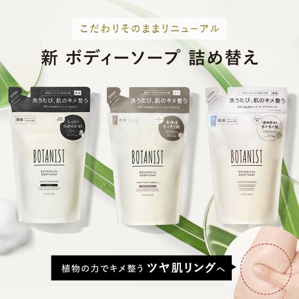 リニューアル BOTANIST ボタニスト ボタニカルボディーソープ 【モイスト】【ディープモイスト】【クリアクレンズ】 詰め替えパウチ 単品 425mL「植物の恵みで、洗うたび、肌のキメ整う」しっとりと保湿しながら洗い、なめらかな素肌へ。しっとりと保湿しながら洗い、なめらかな素肌へ。・乾燥が気になる方 ・しっとりした洗いあがりが好みの方 ・なめらかな肌になりたい方(モイスト)保湿しながら洗い、もっちりと潤いヴェールのある素肌へ。・特に乾燥が気になる方 ・とてもしっとりした洗いあがりが好みの方 ・もっちりした肌になりたい方(ディープモイスト)無添加[合成着色料フリー] [パラベンフリー] [サルフェート※1 フリー] [アルコールフリー]くすみオフで、透明感のあるすべすべ素肌へ。・くすみが気になる方 ・さっぱりした洗いあがりが好みの方 ・すべすべ肌になりたい方(クリアクレンズ)
