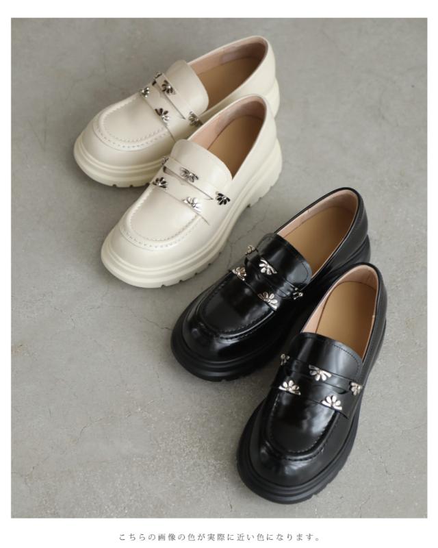 再入荷11月14日 フラワーパーツデコレーションのクラシカルローファー ローファー 靴 シューズ レディース ファッション 秋 冬 春 cawaii w60751ps 35~39対応 ブラック アイボリー 日常使い おでかけ キレイめ シンプル ミセス 30代 40代 50代