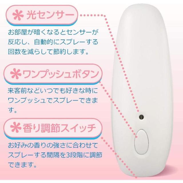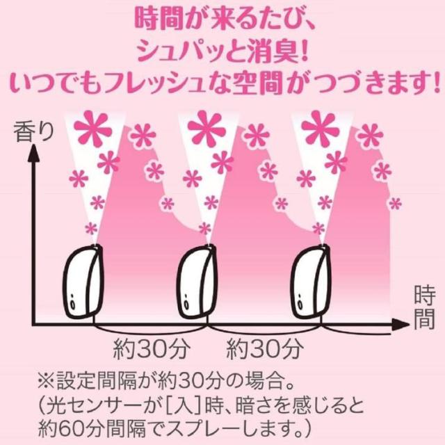 ●消臭芳香ミストが一定のタイミングでシュパッとひろがるので、使いはじめから終わりまで一定の消臭効果が持続し、いつでも新鮮な香りで心地よい空間が実感できる「電池式自動消臭芳香スプレー」です。