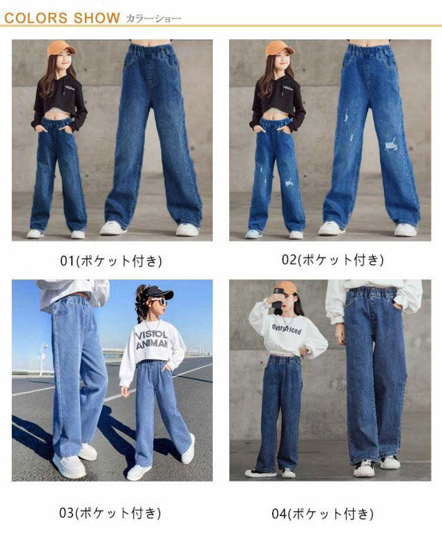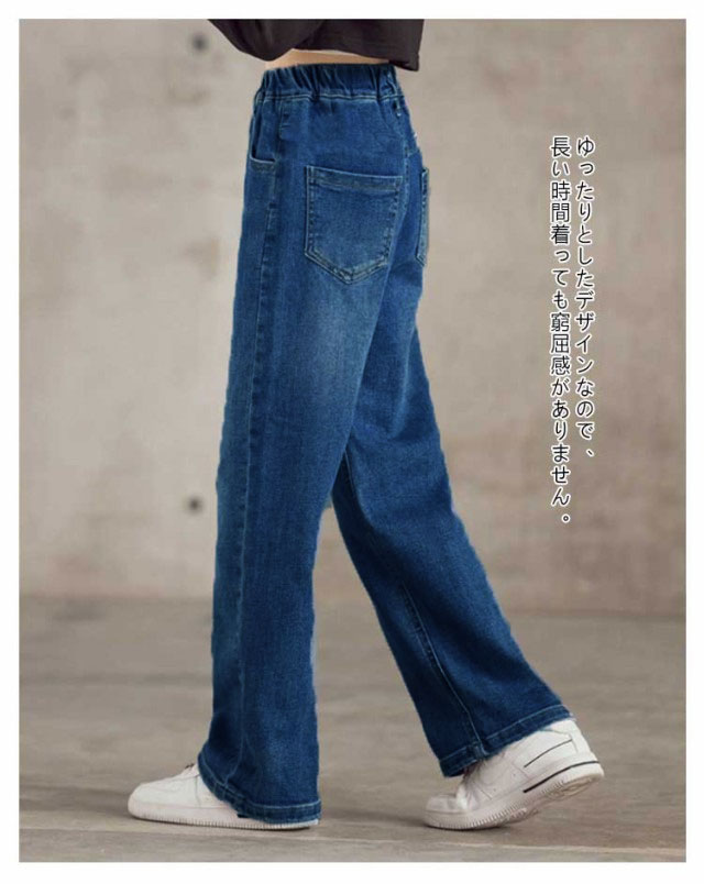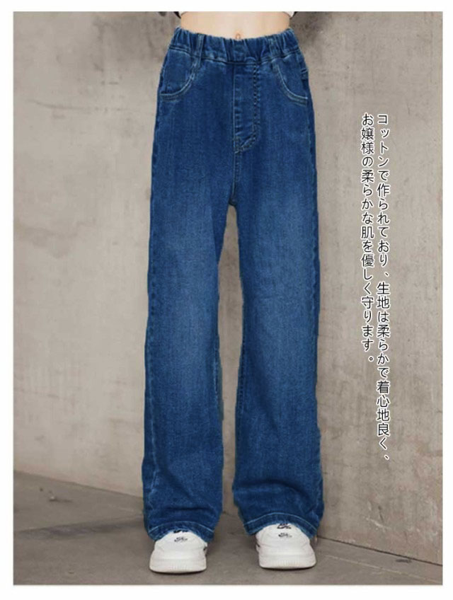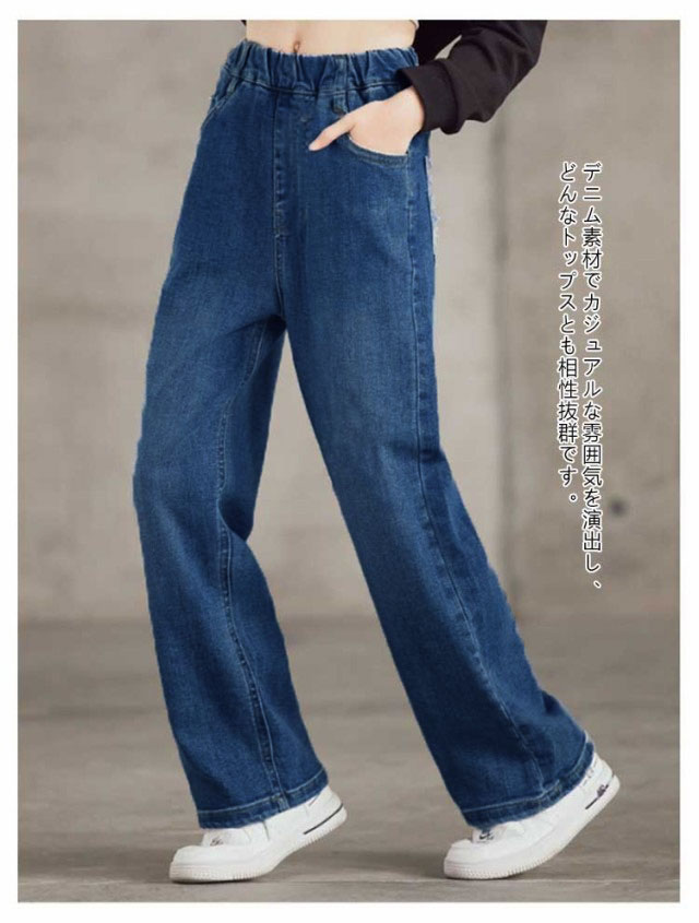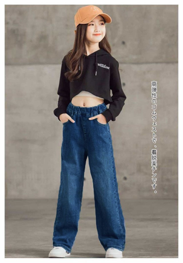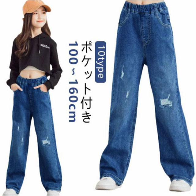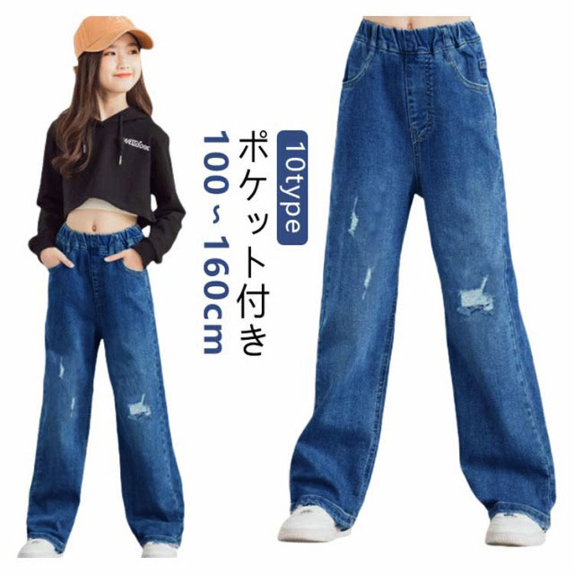 デニムパンツ 女の子 キッズ ダンス 衣装 ワイドパンツ 子供服 ジーパン ウエストゴム ダメージ ジーンズ 長ズボン ロングパンツ ジュニア 小学生 中学生 韓国 おしゃれ ボトムス 通学 100 110 120 130 140 150 160cm ガールズ カジュアル ゆったり