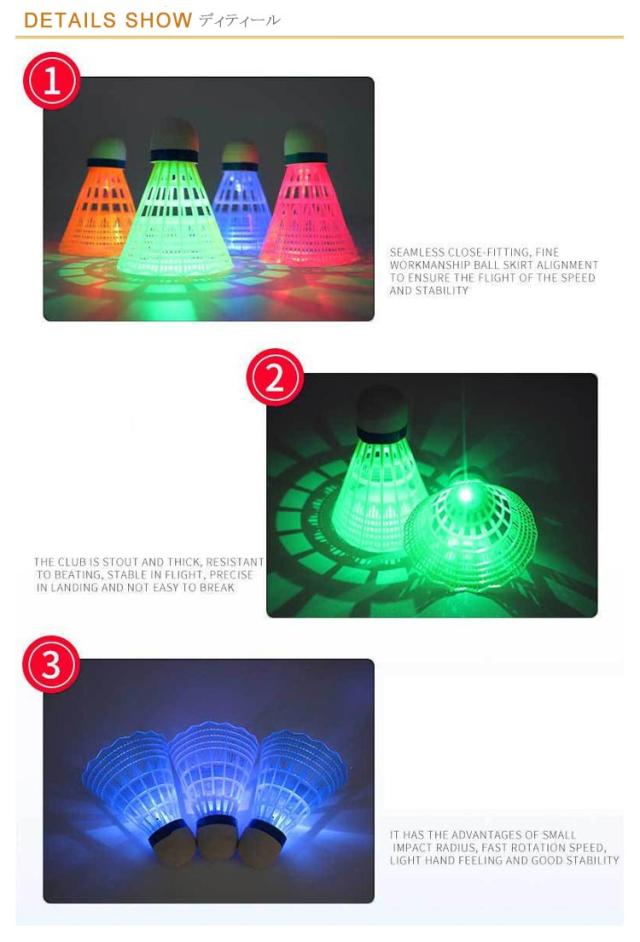 | 6個セット!練習しやすい、夜でも遊べる光るシャトル! 自宅で楽しく楽しくバドミントントレーニングできます。 | |