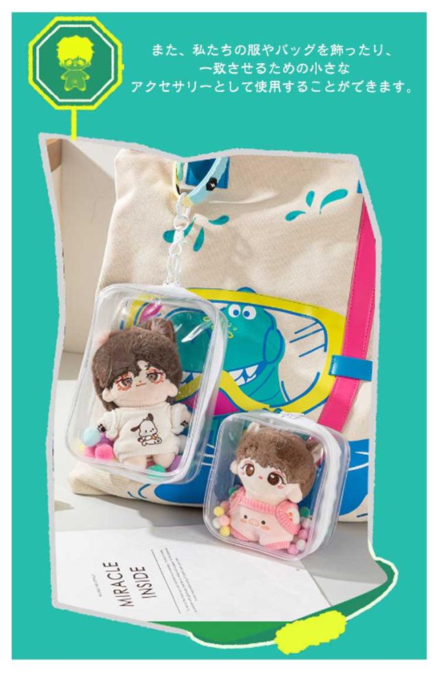 | ぬいぐるみバッグはPVC素材で作られており、丈夫で柔らかく、黄色になりにくく、耐久性があります。 バッグに人形を入れて、水やほこりから人形を保護することができます。 ぬいぐるみバッグは完全に透明なデザインで、人形をはっきりとディスプレイすることができ、外出用バッグとして理想的です。 キーホルダーとスポンジボールが付属しており、スポンジボールは人形を飾ることができ、人形をよりかわいく見せることができます、一緒に外出するためにあなたのバッグやバックパックに掛けることができ、また、私たちの服やバッグを飾ったり、一致させるための小さなアクセサリーとして使用することができます。 あらゆるぬいぐるみ、人形、バッジなどの収納に適しています。この透明なぬいぐるみポーチは、コミックに参加したり、外出したり、ショッピングしたり、旅行したりするのに適しています。 | |