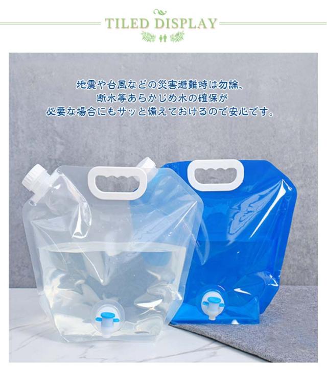 | 【3個セット】【蛇口付き】【5L 10L】【折り畳み】 地震や台風などの災害避難時は勿論、断水等あらかじめ水の確保が必要な場合にもサッと備えておけるので安心です。 その他、キャンプやバーベキュー、ピクニック、海水浴など水道の無いアウトドアシーンでも大活躍します。 安全性無毒で環境に優しい、長持ちで耐用性があります。 キャップも付くので、水がこぼれず安心。また、水を入れるとしっかりと自立するため使い勝手も抜群です。 持ち運びに便利なハンドル付きなので外出でもご利用いただけます。 ポータブルで折り畳み式ウォーターバッグ。 バーべキュー、キャンプ、防災、アウトドアに最適! | |