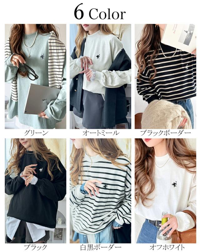 クラシカルエルフ春新作 トップス Tシャツ レディース ワンポイント 胸 刺繍 入り モックネック 長袖 Tee 無地 ボーダー ロングシーズン レイヤードコーデ インナー 着回し 大きいサイズ 2026ss ce1050216