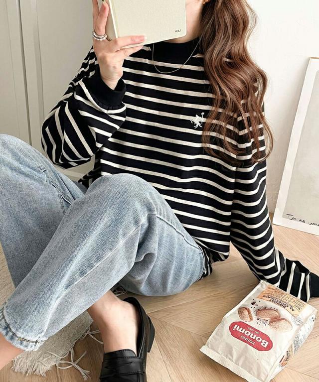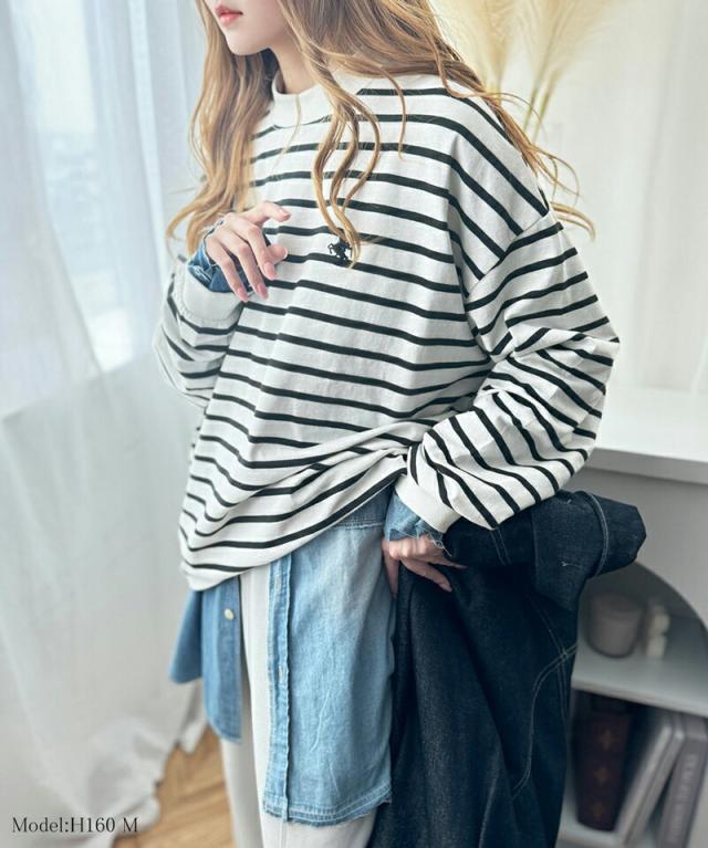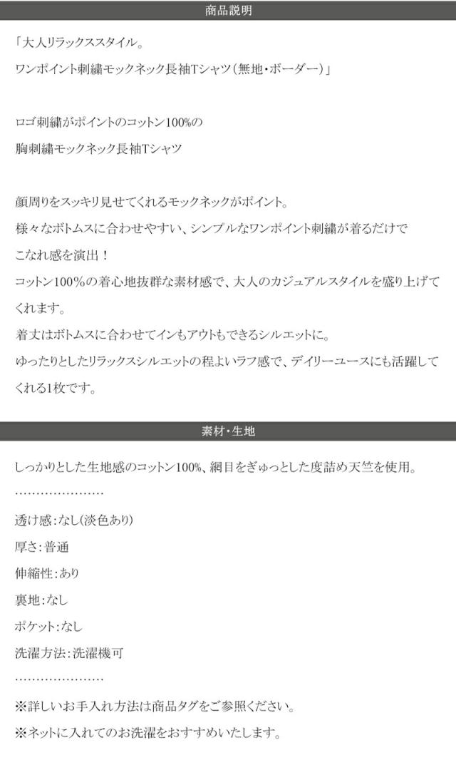 ★大人リラックススタイル。ワンポイント刺繍モックネック長袖Tシャツ(無地・ボーダー)★