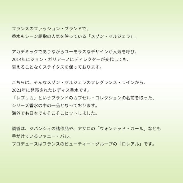 「レプリカ」というブランドのカプセル・コレクションの名前を取った、シリーズ香水の中の一品となっております。海外でも日本でもそこそこヒットしました。