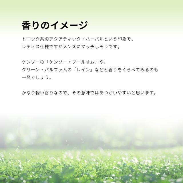トニック系のアクアティック・ハーバルという印象で、レディス仕様ですがメンズにマッチしそうです。ケンゾーの「ケンゾー・プールオム」や、クリーン・パルファムの「レイン」などと香りをくらべてみるのも一興でしょう。かなり軽い香りなので、その意味ではあつかいやすいと思います。