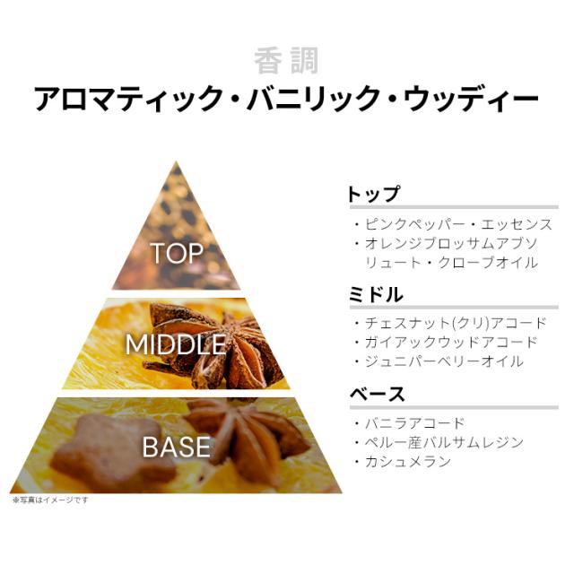 ピンクペッパー、エッセンス、オレンジ・ブロッサム・アブソリュート、クローブ・オイルなどが、大人っぽいウォーム・スパイシーを香り立たせるトップから、