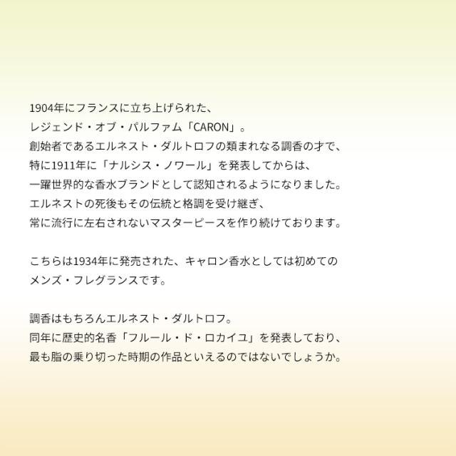 こちらは1934年に発売された、キャロン香水としては初めてのメンズ・フレグランスです。シプレー・ウッディー・ノートの、厳格なジェントル・スタイルを貫く香調をベースにしており、品のある大人の男性による、品のある大人の男性のためのアイテムに仕上がっております。ベルガモット、レモン、ラベンダー、ローズマリーなどがクラシカルな趣きのハイ・ソサイエティーを醸し出すトップから、クラリセージ、ローズ、ローズウッド、シダーウッドなどがエレガントな甘さを引き立てて極上のダンディズム光らせるミドルへ。ラストはバニラ、ムスク、トンカビーンズ、モスなどがコクのあるマイルドな男のロマンティック・スウィートを立ち表させ、時代を超えて愛される詩情豊かなマスキュリニティーを浮かび上がらせてくれそうです。現在プロダクトはアレス・グループ。フォーマルなスーツ以外には似合わないような香りで、シプレーではあるもののラストの甘さがしなやかな柔らか味を与えております。