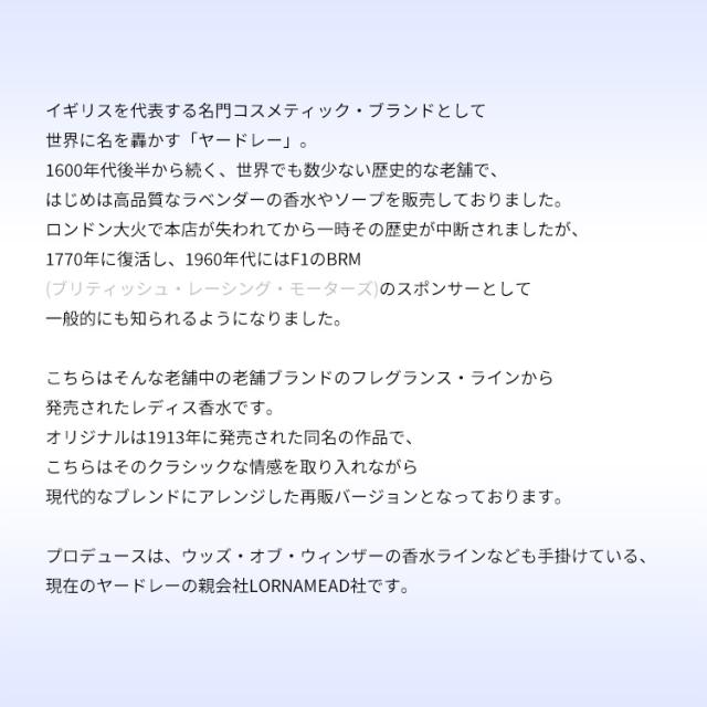 イギリスを代表する名門コスメティック・ブランドとして世界に名を轟かす「ヤードレー」。1600年代後半から続く、世界でも数少ない歴史的な老舗で、はじめは高品質なラベンダーの香水やソープを販売しておりました。ロンドン大火で本店が失われてから一時その歴史が中断されましたが、1770年に復活し、1960年代にはF1のBRM(ブリティッシュ・レーシング・モーターズ)のスポンサーとして一般的にも知られるようになりました。