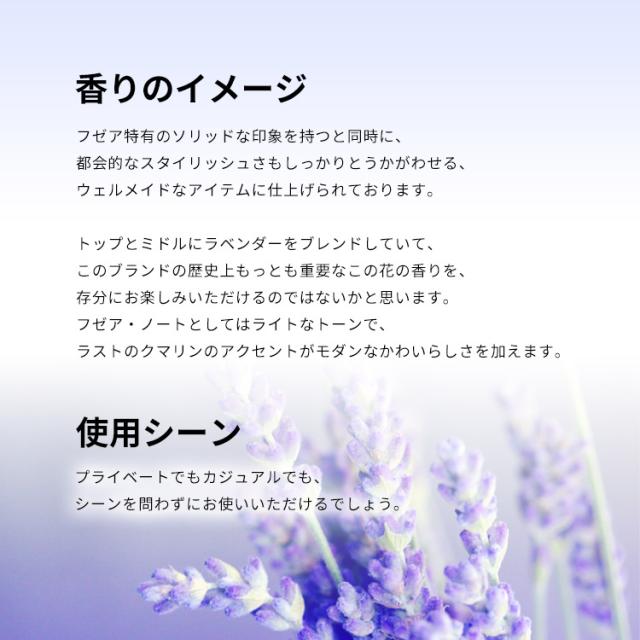 フゼア・ノートとしてはライトなトーンで、ラストのクマリンのアクセントがモダンなかわいらしさを加えます。プライベートでもカジュアルでも、シーンを問わずにお使いいただけるでしょう。