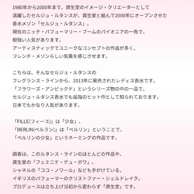 「フラワーズ・アンピックド」というシリーズ物の中の一品で、セルジュ・ルタンス香水でも屈指のヒット作として知られております。日本でもかなり人気があります。