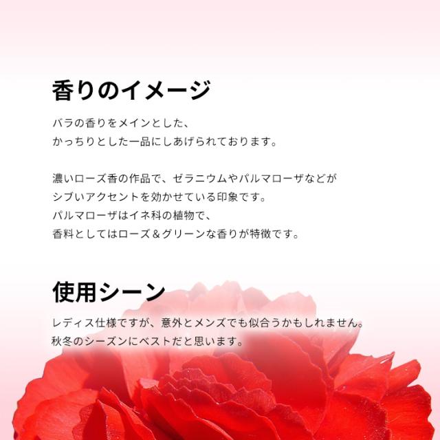 ローズやゼラニウムなどが、エレガントで格調高いようなロージー・スパイシーを香り立たせるトップから、
