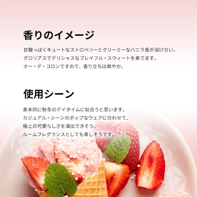 こちらは名前の通りストロベリー・アイスクリームの香りの一品です。甘酸っぱくキュートなストロベリーとクリーミーなバニラ香が溶け合い、グロリアスでデリシャスなプレイフル・スウィートを奏でます。基本的に秋冬のデイタイムに似合うと思います。カジュアル・シーンのポップなウェアに合わせて、極上の可愛らしさを演出できそう。いかにも女の子といった雰囲気のハッピーな一品です。マイルドなベリー系をお求めの方は、ぜひお試しくださいませ。