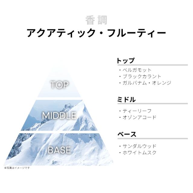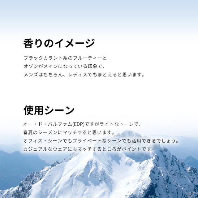 アルプスの雪山をイメージした一品で、香りはアクアティック・フルーティーのポップな香調がベース。メンズよりはユニセックスなアイテムにしあげられております。