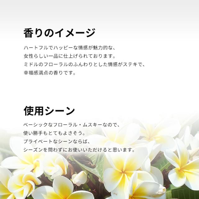 プロデュースは、オズベクやル・ジャルダンなどのラインも手がけている、親会社の「IPD FRAGRANCES」です。ミドルのフローラルのふんわりとした情感がステキで、幸福感満点の香りです。ベーシックなフローラル・ムスキーなので、使い勝手もとてもよさそう。プライヴェートなシーンならば、シーズンを問わずにお使いいただけると思います。