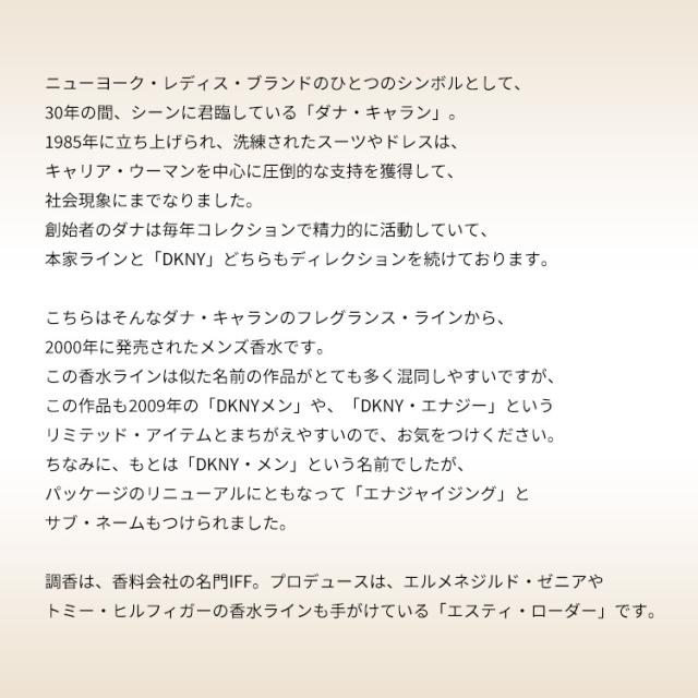 こちらはそんなダナ・キャランのフレグランス・ラインから、2000年に発売されたメンズ香水です。この香水ラインは似た名前の作品がとても多く混同しやすいですが、この作品も2009年の「DKNYメン」や、「DKNY・エナジー」というリミテッド・アイテムとまちがえやすいので、お気をつけください。ちなみに、もとは「DKNY・メン」という名前でしたが、パッケージのリニューアルにともなって「エナジャイジング」とサブ・ネームもつけられました。香りはピリッととがった印象のアロマティック・シトラスの香調がベース。都会を颯爽と闊歩するような、ブランド・イメージに見事にマッチングする一品に仕上がっております。