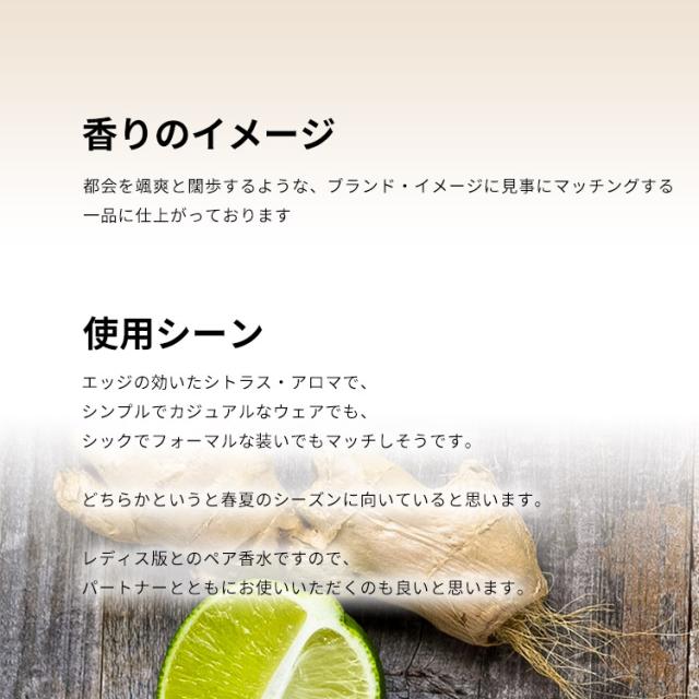 調香は、香料会社の名門IFF。プロデュースは、エルメネジルド・ゼニアやトミー・ヒルフィガーの香水ラインも手がけている「エスティ・ローダー」です。エッジの効いたシトラス・アロマで、シンプルでカジュアルなウェアでも、シックでフォーマルな装いでもマッチしそうです。どちらかというと春夏のシーズンに向いていると思います。レディス版とのペア香水ですので、パートナーとともにお使いいただくのも良いと思います。