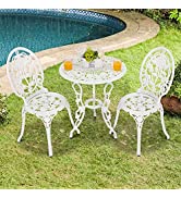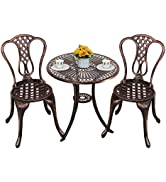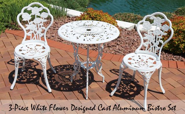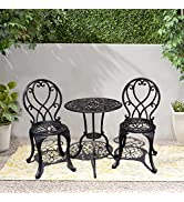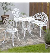 【ビストロ3点セット】ベランダテーブル直径60cmのアルミ鋳物製テーブルとチェアは、エレガントなスクロール天板とアンティーク仕上げで、テラスのアクセントに最適です。チェアと組み合わせれば、一年中使えるビストロセットで、メンテナンスフリーのアウトドアシーティングを実現します。