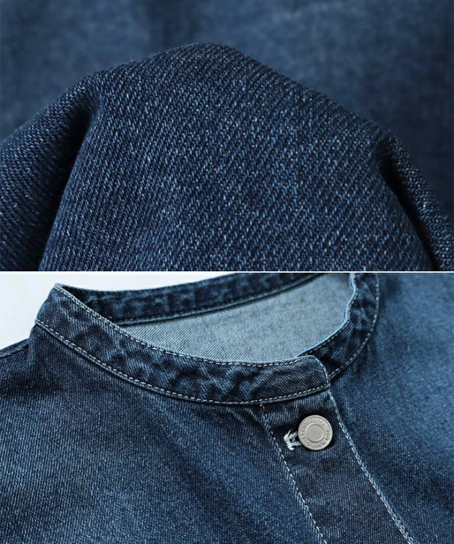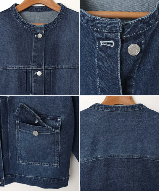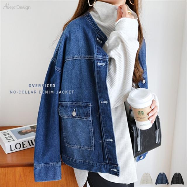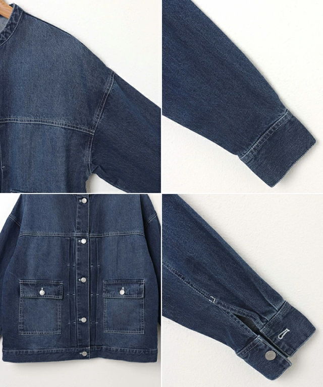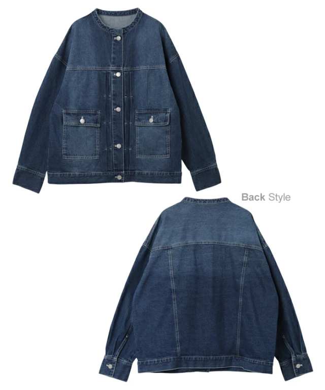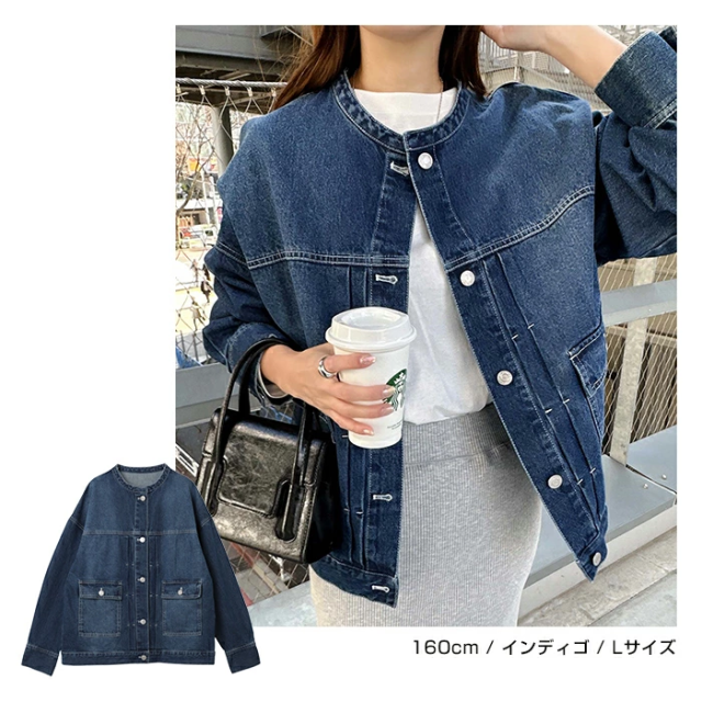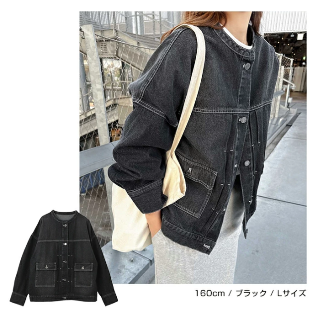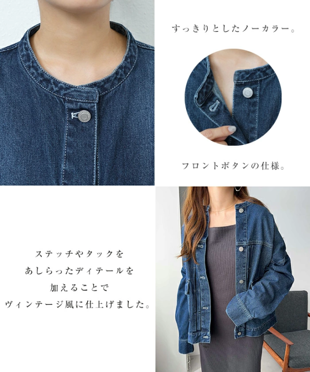 t04 オーバーサイズ ノーカラー デニム ジャケット レディース ツイル 配色ステッチ ウォッシュ加工 タック ドロップショルダー ヴィンテージ ゆったり こなれ感 アウター 大人 きれいめ おしゃれ カジュアル ナチュラル シンプル オフィス 女性 Gジャン 春 秋 冬 M