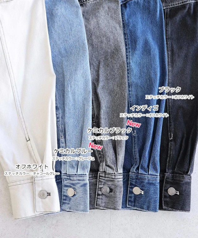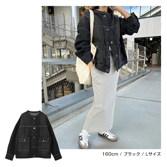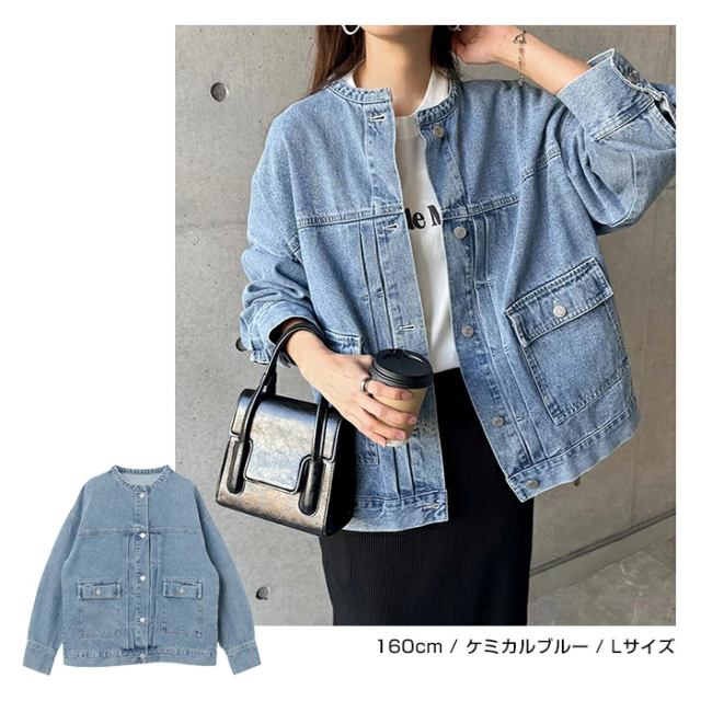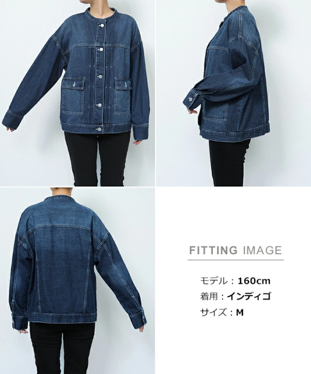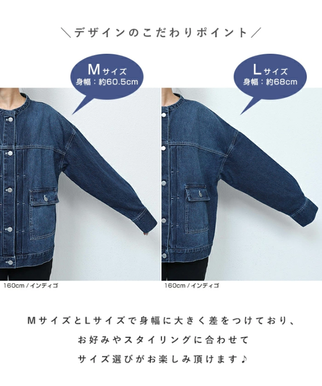 ノーカラー×オーバーサイズのシルエットが映える!程よい厚みと風合いが、こなれ感たっぷりなデニム・ジャケットが新登場!配色ステッチがアクセントになる1枚。インディゴデニムとブラックデニムは色落ち変化が楽しめる《デニム素材》、オフホワイトはナチュラルな風合いがこなれ感たっぷりな《ツイル素材》を使用し、お好みに合わせて素材が選べるカラバリもポイントです。程よい厚みのあるクタッとしたコットンが、ナチュラルな風合いで、抜け感たっぷりな装いに♪MサイズとLサイズで、身幅に大きく差をつけており、お好みやスタイリングに合わせてサイズ選びがお楽しみ頂けます。