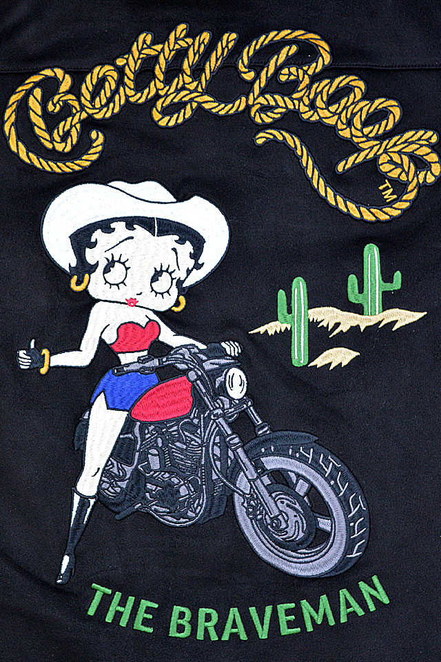 背中には愛車で荒野を駆け巡る、カウガールスタイルのベティが刺繍で落とし込まれています。