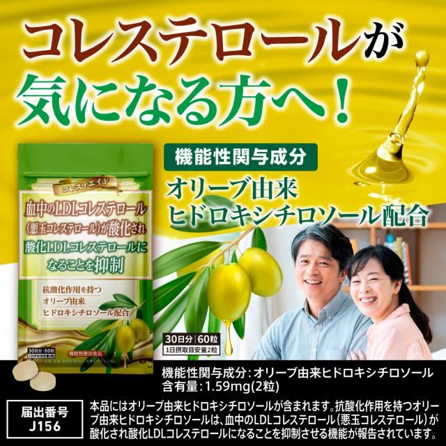 ・【コレステエイド】コレステロールが気になる方へ、抗酸化作用を持つオリーブ由来ヒドロキシチロソールがコレステロールへ働きます