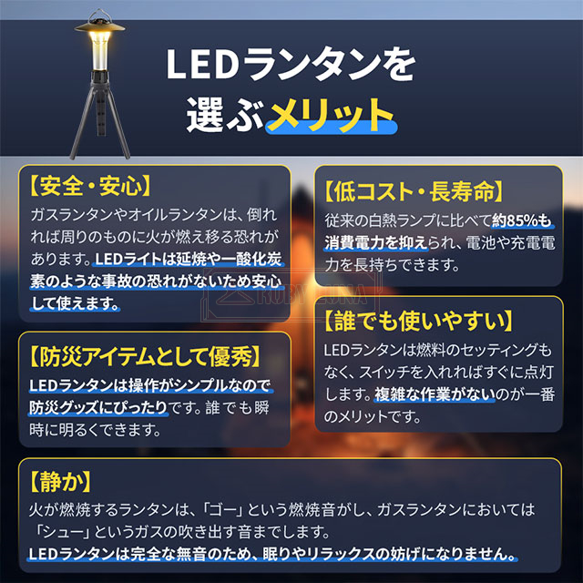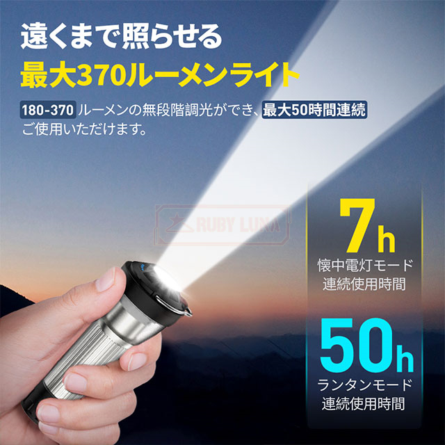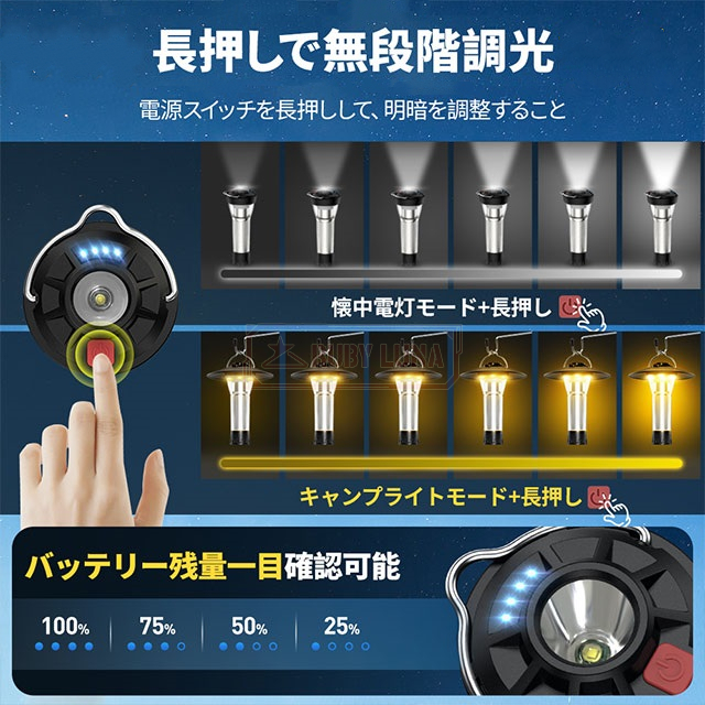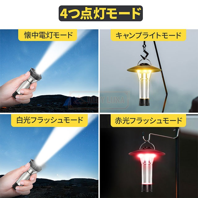| 特徴 | ◆【アウトドアに最適】 ◆USB充電式なので屋外での充電に便利で、電量のほうはご心配には及びません。業界初の4つの点灯モードが用意されており、キャンプライト用途以外に、懐中電灯としても使用できるため、遠くまで照射し、復雑なアウトドア環境にも対応できる。緊急時にはSOSライトとしても使えるので、野外、災害、アウトドアでの活働にこのランタンがひとつあると安心な存在です! 【安心感あふれる使用時間・緊急充電】 ◆2000mAHのバッテリーで最大50時間の持続照明が可能、キャンプ ランタンや懐中電灯の照明モードは180 ~ 370ルーメンの明るさ調節も自由で、シーンに応じて照明モードを変えることができ、1つのランタンでさまざまなアウトドア活働に対応します。本体にtype-cポートが付属しており、キャンプなどでの緊急時にはスマホを充電できる。 【3つの光源・4つ点灯モード・無段階調光】 ◆LEDランタンが3つの光源:暖かい光/白い光/赤い光。4つ点灯モード:懐中電灯モード/白点滅モード/キャンプライトモード/赤点滅モード。LEDライトや懐中電灯モードでは、スイッチを長押しすることで光の明るさを調節できます。 【落下に強い本体・しっかりした金属三脚】 ◆電気式ランタンの本体は実験室環境下で複数回の落下テストをクリアしており、アウトドアでうっかり落とすなどの場合でも、簡単に破損することはありません。アルミ合金製の三脚は、他のプラスチック三脚より質感アップがあり、複雑な屋外天候に対応し、腐食しにくく、耐久性が高いです。また、転倒 の心配もない安定性があります。 【ポータブル・防水防塵・野外適用】 ◆手のひらサイズで場所を取らず、登山やハイキングの際にはランタンをリュックにぶら下げて両手を解放することもできる。防水防塵材料は、一般的な雨やほこりを防ぎ、アウトドアの復雑な環境の変化を心配しません。 ※ランタンは長時間水につかってはいけません。水がたまっている場合は、照明に影響を与えないように早速に清潔な布で拭き取ってください。 【こだわりのデザイン】 ◆本体単独で懐中電灯として使えます。先端にステンレスのフックがついているので、木やテントの中に吊り下げて照明灯にするのもアリです。マグネットベースは、金属物に吸着し、さまざまな角度を調節して使用することができます。三脚を組み立てれば、キャンプ場のテーブルやピクニックマットに置き、キャンピングライトとしても使えます。 |