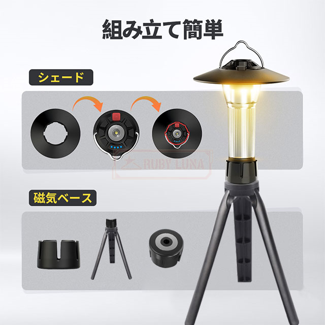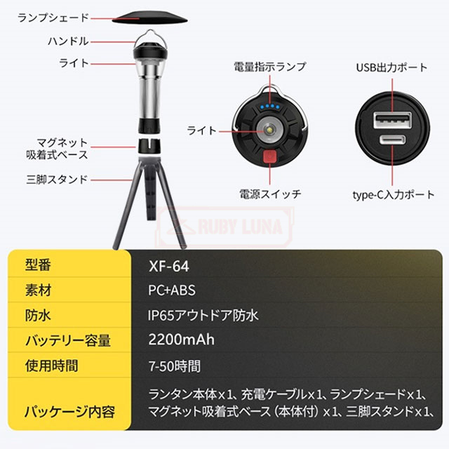 | パッケージ内容 | ◆ランタン本体*1 ◆取り外し可能なランプシェード*1 ◆磁気ベース*1(本体付) ◆USB充電ケーブル*1 ◆三脚スタンド*1 |