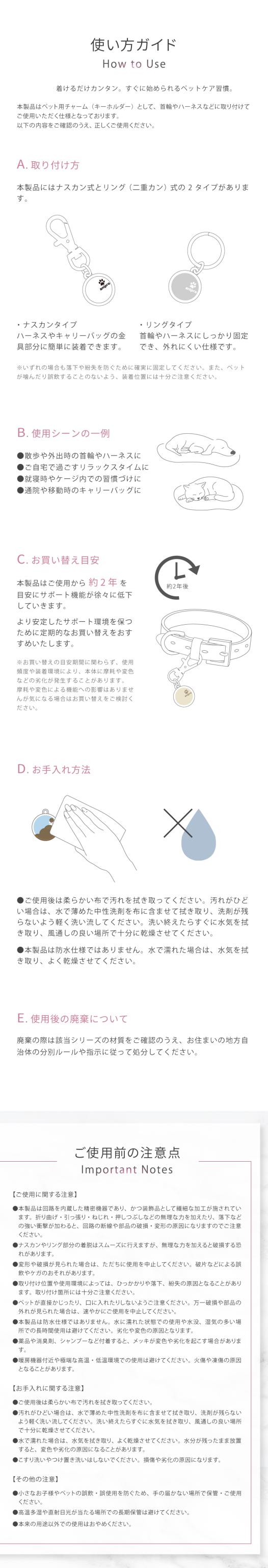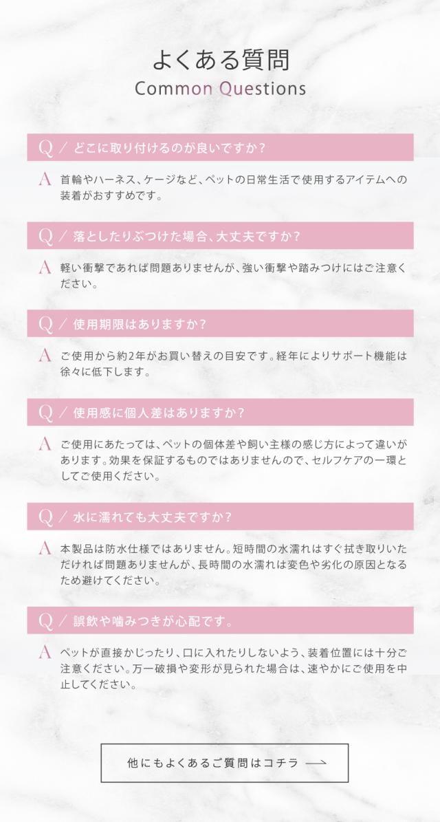 | 設置場所 | 首輪・ハーネス・リードなど、ペットが日常的に身につけるアイテムへ取り付けてご使用いただけます。 ※本製品はペット用のチャームです。スマートフォンやタブレットなど電子機器に直接貼る用途ではありません。 ※家電周りでの電磁波ケアをご希望の場合は、家電製品用ステッカー「Wave Defense」のご利用を推奨しております。 |
