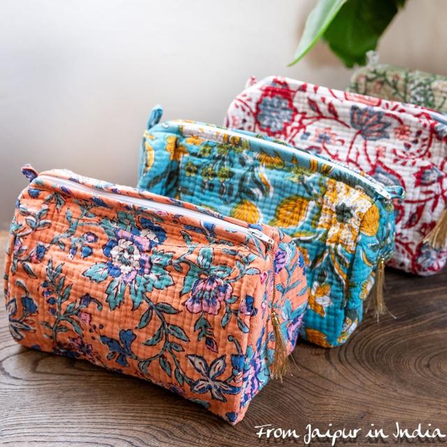 かわいいボタニカル柄の木版染め 大きめポーチ【9色展開】 / メイクポーチ、ポーチ、小物入れ、メイクバッグ、プレゼント、おむつポーチ、おむつバッグ、出産祝い, バッグ 【インドとアジアンバッグ