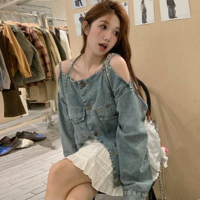 華奢で上品な印象のオフショルダーデニムジャケット。