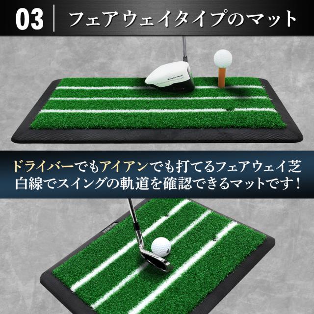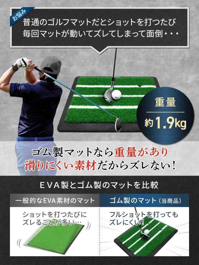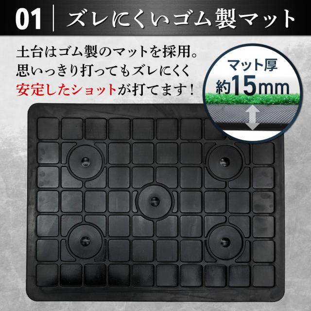 【ズレにくいゴム製土台マット】思いっきりショットを打ってもずれないように土台にはゴム製マットを使用。一般的なEVA製マットやSBR製マットだとショットした瞬間動いてしまい、いちいち元に戻す作業が発生しますが、ゴム製マットは重さがあるので簡単には動きません!