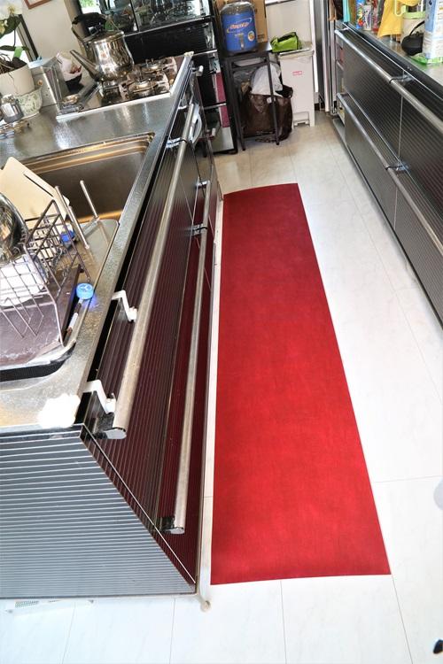 【シリカゲルで吸水乾燥脱臭するお洒落なダークレッドキッチンマット!システムキッチンにピッタリ】汚れもサッと拭けて後のジメジメ臭いはマット内部のシリカゲルが取ってくれる優れもの!スベリ止め加工シートなのでズレない!【新開発】厚み1mmで足に引っかからない超薄型。(水滴が落ちるとスッーと消えます)長期間臭わないので長期間使用可能。(材質)シリカゲル・ダークレッドポリエステル不織
