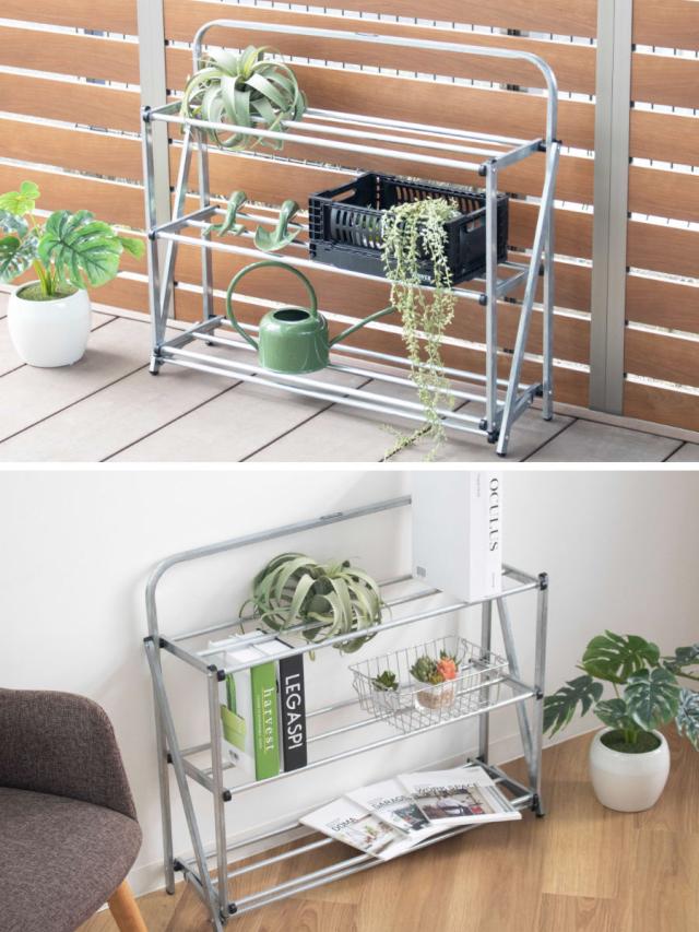 シンプルで無駄のないデザインなので玄関以外の空間にも馴染みます。グリーンやジョウロを置いて園芸ラックにしたり、リビングで小物やインテリアを飾るのもオススメです。
