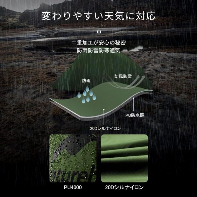 | 素材 | フライシート:20Dナイロン(耐水圧PU4000mm) インナーシート:高密度B3ナイロンガーゼ、20Dナイロン ポール:7001航空アルミニウム合金ポール グランドシート:150Dオックスフォード布(PU3000mm) |