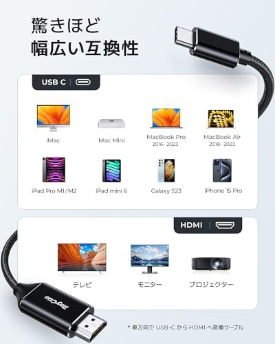 【 iPhone16 シリーズにも対応!2M USB-HDMI 変換ケーブル】本製品はタイプCからHDMIへ分岐をサポートする変換アダプターです。プラグアンドプレイでドライバーインストール不要、WiFi接続不要、挿すだけで利用できて非常に便利です。スマホ、タブレット、パソコンのタイプCポートに接続し、テレビやプロジェクターに出力できます。HDMIケーブルを別途購入必要なくて便利です。※もし出力できないの場合はパソコン自体のグラフィックカードのドライバーを更新してください。またHIDM信号からタイプCへの変換は出来ません。