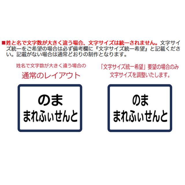 ■姓と名で文字数が大きく違う場合、文字サイズは統一されません。文字サイズ統一をご希望の場合は必ず備考欄に『文字サイズ統一希望』と記載ください。記載がない場合は通常どおりの制作となります