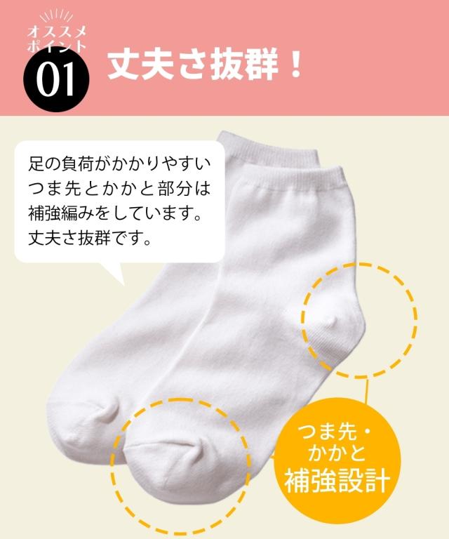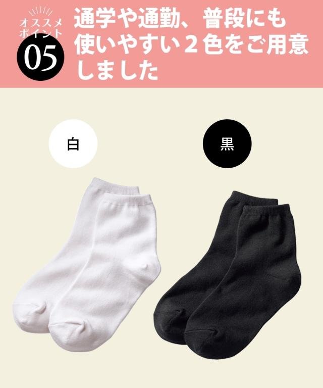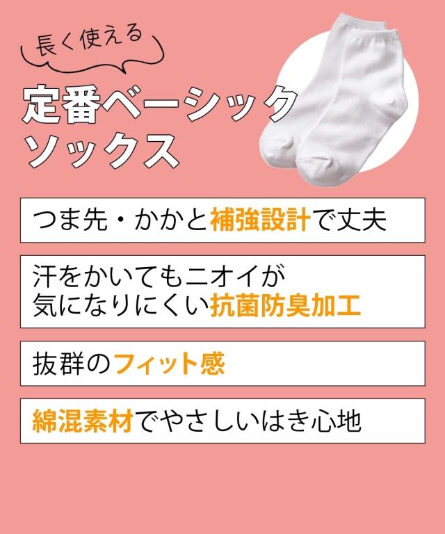 ニッセンオリジナル無地 抗菌防臭 しっかりした生地のクルーソックス しっかり丈夫な仕様 〜選ばれる6つのポイント〜 ■つま先かかと補強設計 足の負荷かかかりやすいので補強編みをしています。 だから丈夫さ抜群です ■抗菌防臭加工 毎日汗をかいて活発に活動してもニオイが気になりにくいです ■抜群のフィット感 伸縮性があり、長時間はいても快適なはき心地です 足口はズレにくいリブ仕様です ■さらりとした綿混素材 綿を使った靴下ならではのやさしいはき心地です 通気性がよく、普段使いにもぴったりです ■洗い替え用にセットでご用意 洗い替えに便利なセット組です ■使いやすい2色からお選びできます 通学や通勤、普段にも使いやすい白と黒の2色をご用意しました ○サイズ 足の大きさが23cmから25cmまで対応しております 同シリーズのショート丈も取り扱っております。