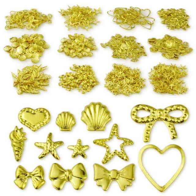レジンクラフト・アクセサリーやセルフネイルで大活躍のメタルデコ素材です。マリン風アートにに欠かせないスターフィッシュ・貝殻モチーフ、またシンプルで可愛いハート・リボンなどの封入パーツが12種類300枚揃えます。