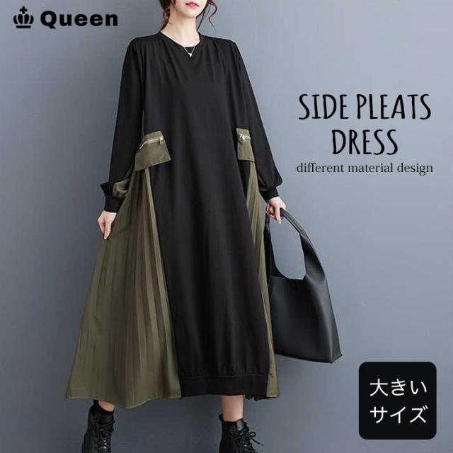 ★☆大きいサイズ レディース 異素材切り替えワンピース 長袖 プリーツ ミリタリー フレアワンピ 春 秋 LL 3L 4L 5L 6L ブラック☆★