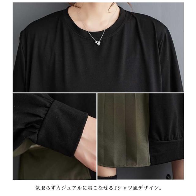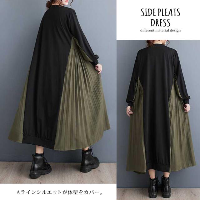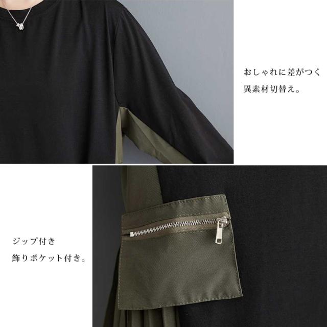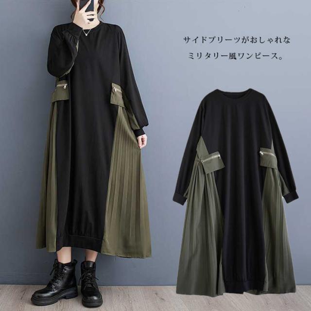 大きいサイズ レディース 異素材切り替えワンピース 長袖 プリーツ ミリタリー フレアワンピ 春 秋 (518085)