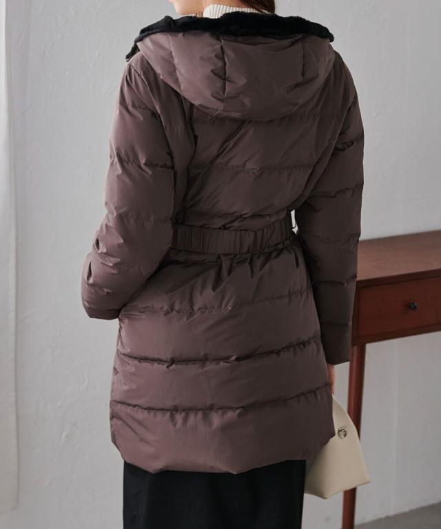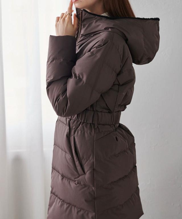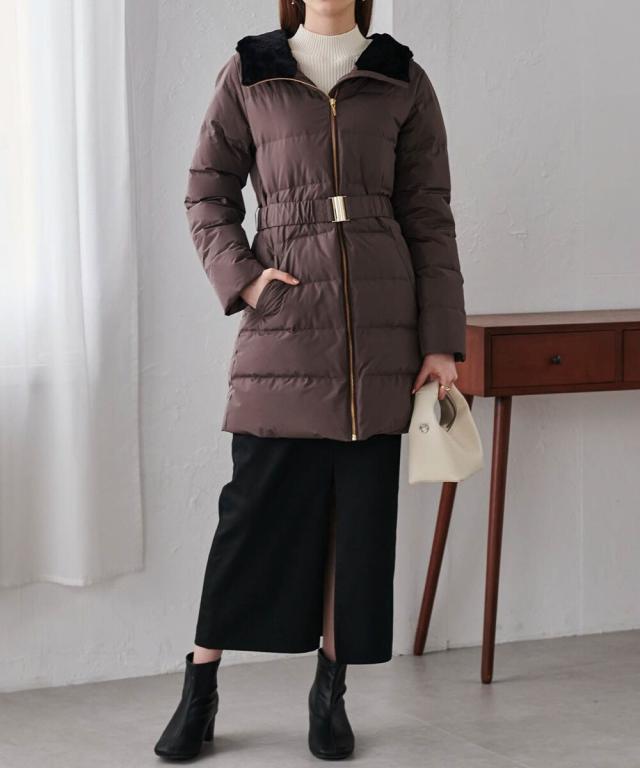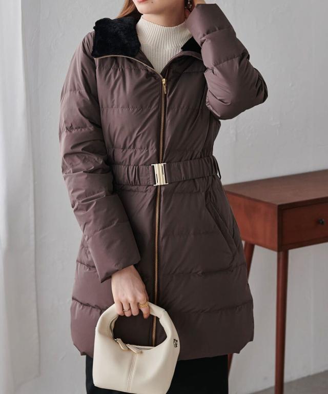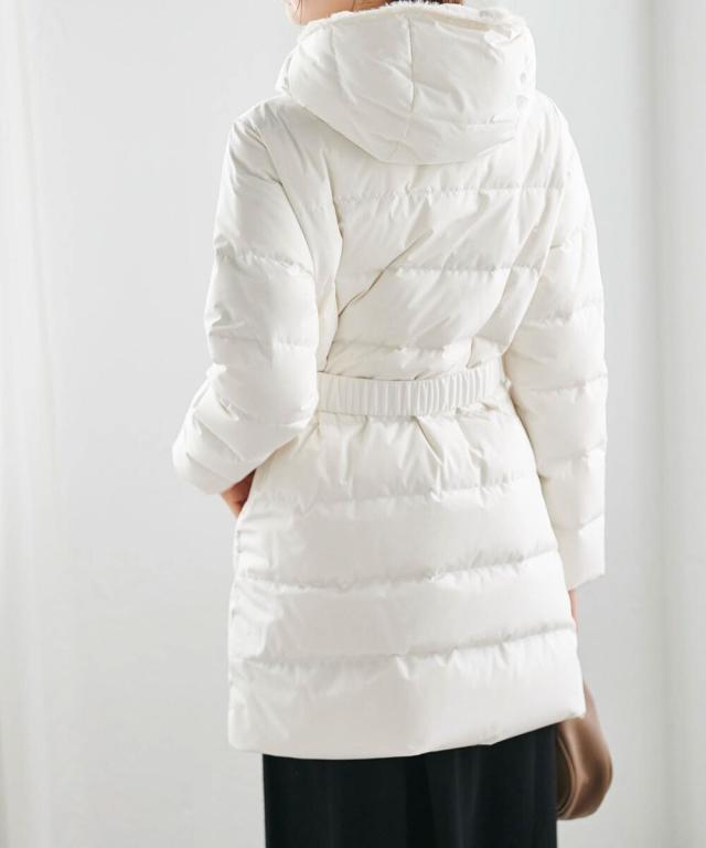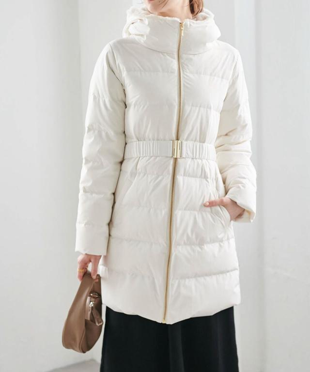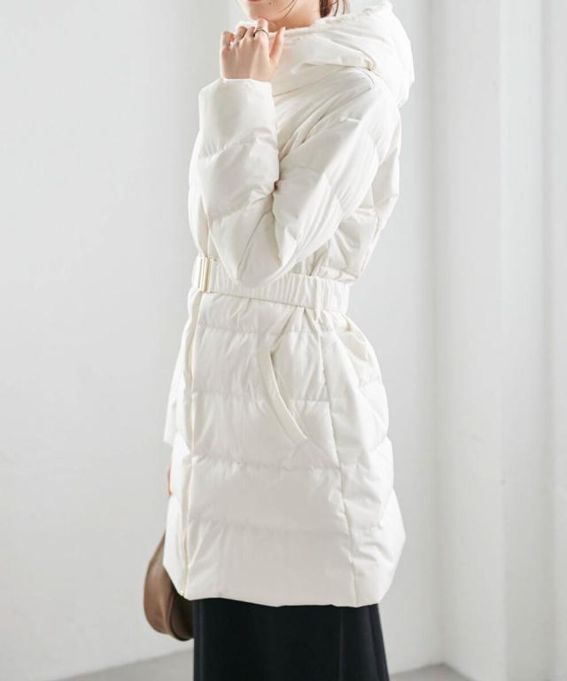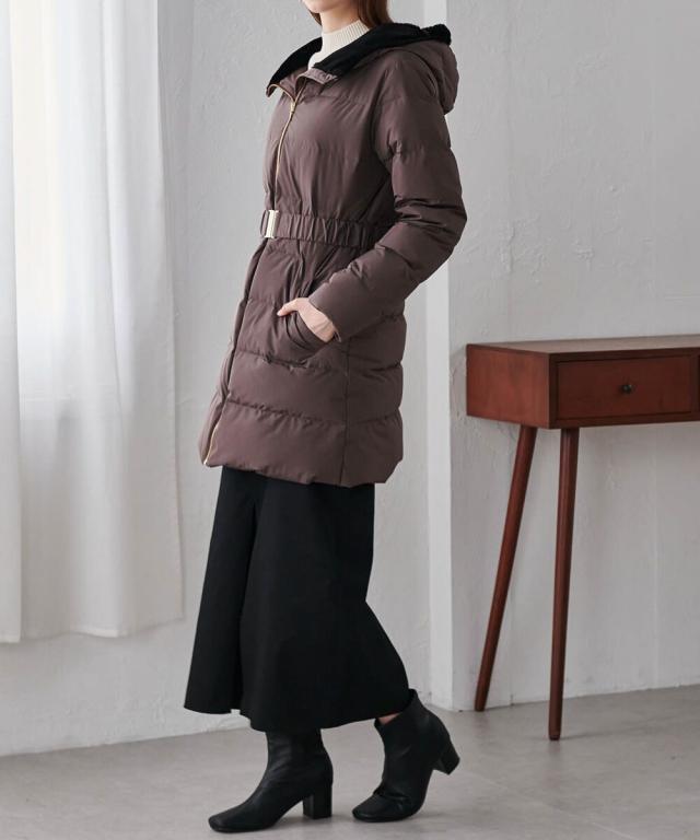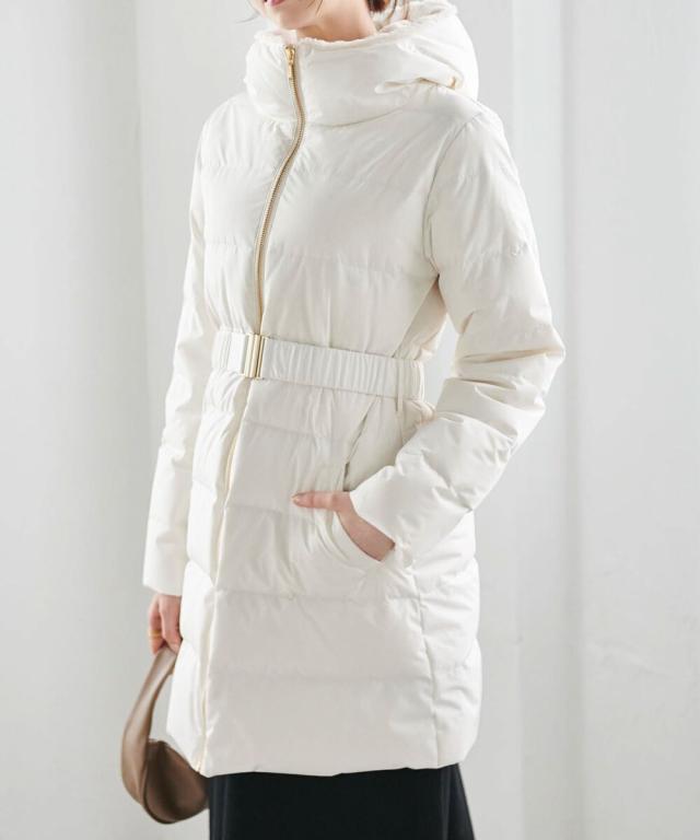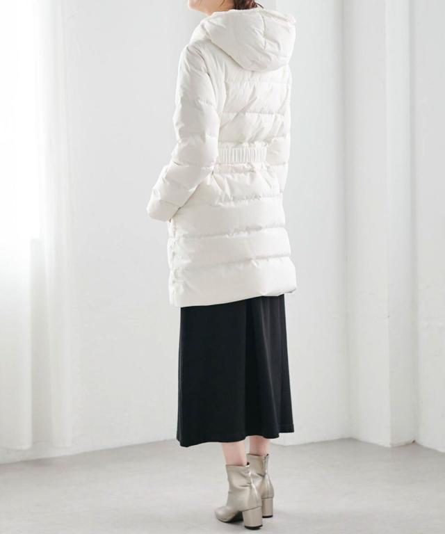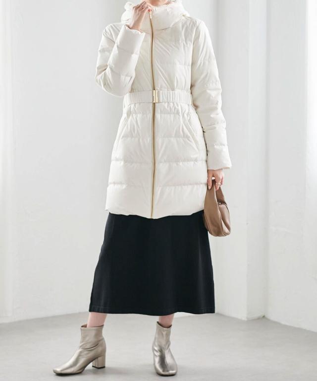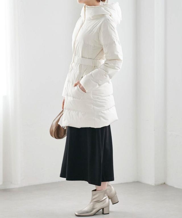 ・付属のベルトでウエストマークすることで、重たく見えがちなロングダウンコートでも