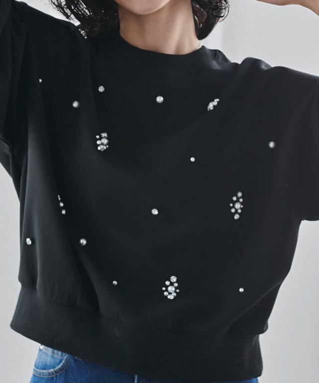 ・今季のトレンドの1つ、きらきらビジューと上品なパールを散りばめたポンチ素材のプルオーバー。
