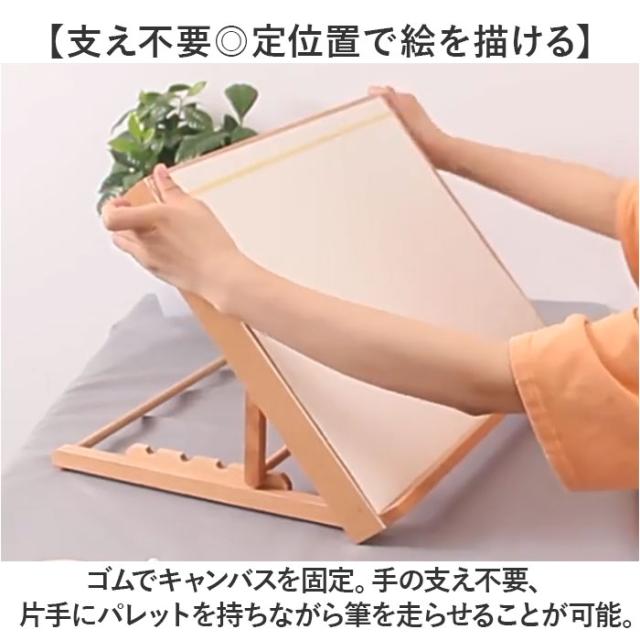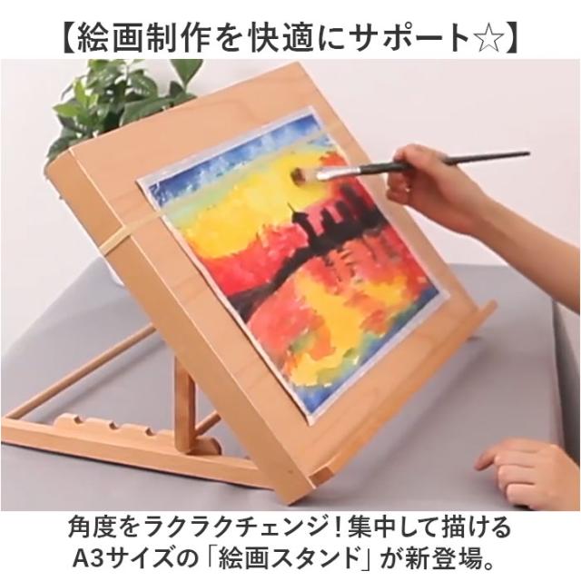 | 商品説明 | 【絵画制作を快適にサポート☆】 ・角度をラクラクチェンジ!集中して描けるA3サイズの「絵画スタンド」が新登場。 【支え不要◎定位置で絵を描ける】 ・ゴムでキャンバスを固定。手の支え不要、片手にパレットを持ちながら筆を走らせることが可能。 【お好みに合わせて4段階角度調節】 ・スタンドの角度は、4段階調節OK。U型のくぼみにセットするだけで、安定性もキープ。 (※1)ケガ防止のため、セットするくぼみがある部分の端が丸く面取りされています。 【衝撃を抑えて傷つきもガード】 ・底面四隅には滑り止め付き。デスクに置く時も静かで、傷つけにくい◎ 【折りたたんでスリムに持ち運び】 ・使わない時は、スタンド部分を折りたためるつくり。持ち運びもスマートに。 【長く使えるナチュラルデザイン】 ・程よく厚みがあり、自然な風合いの木製アイテム。キャンバスサイズに合わせて揃えるのもおすすめ。 (※2)当店別ページにて、サイズ違いのスタンドを販売中です。 |