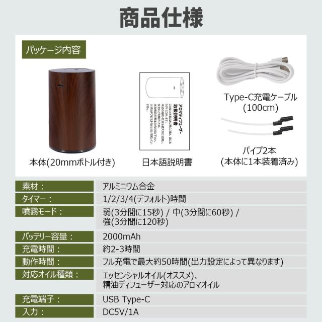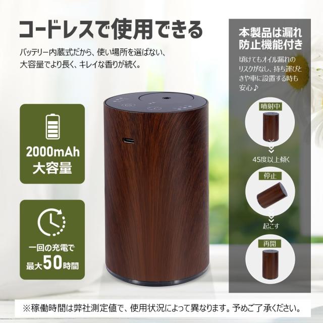 アロマディフューザー ネブライザー式 噴霧量調整可能 コードレス 自動噴霧 静音 アロマ芳香器 卓上 USB充電式 車用ネブライザー 水なし ネブライザー ナチュラル