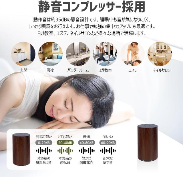 【静音性】内蔵システムは低騒音稼働に設計され、お仕事、休憩、運動、睡眠の時など、ネブライザーは噴霧時の音が40?以下でほぼ騒音が感じないような音です。(注*本アロマディフューザーは完全な静音タイプではないので、音に敏感な方にお勧めません。)