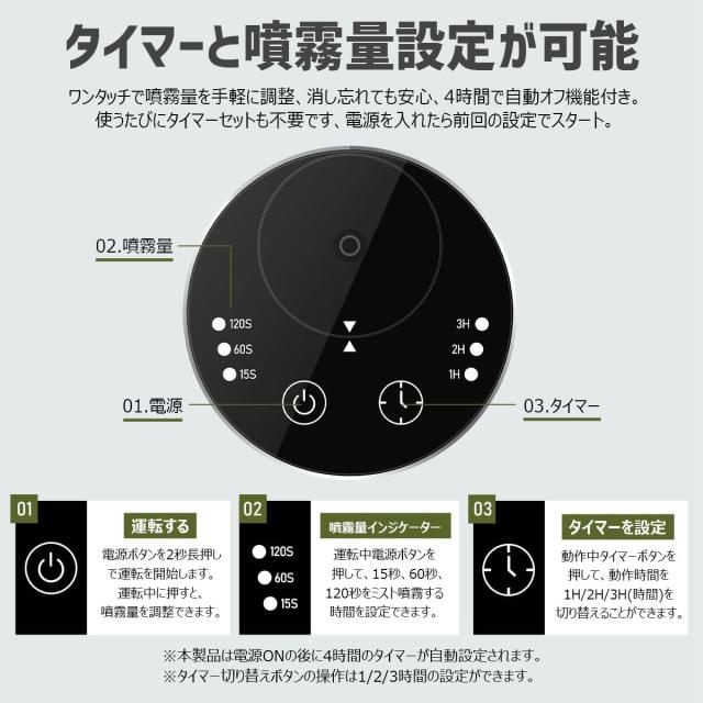 【タイマー調整可能】作動中タイマーボタンを押して、作動時間を1H、2H、3H、を切り替えることができます。ネブライザーの噴霧量が15秒モード、60秒モード、120秒モードを選べます。使う空間の広さに合わせて、細かい時間設定をお薦めします。(注*電源ONの後に4時間のタイマーが自動設定されます。)